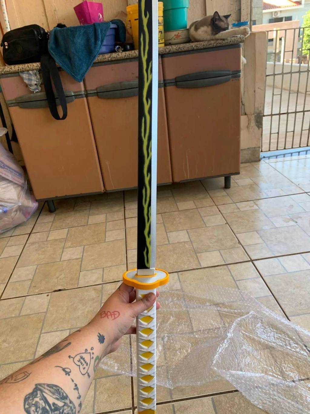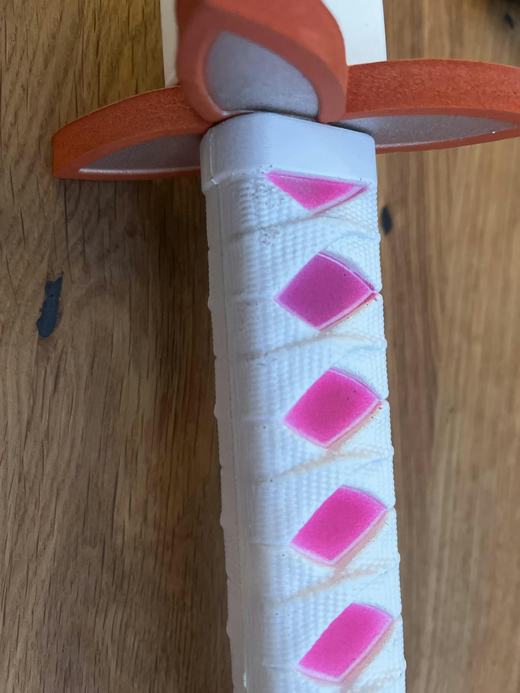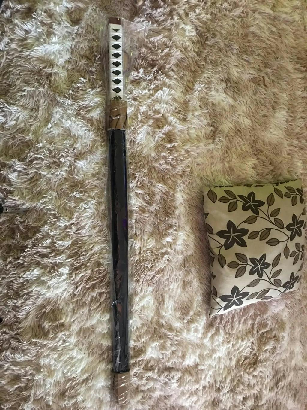 Das Katana hat einige dreckige Stellen, vor allem am Griff, der eigentlich schön weiß sein sollte, außerdem kleine mini risse an der Scheide. Es ist nicht sehr erfreulich, ein Katana in diesem Zustand zu erhalten, vor allem, da die Lieferung so lange gedauert hat.